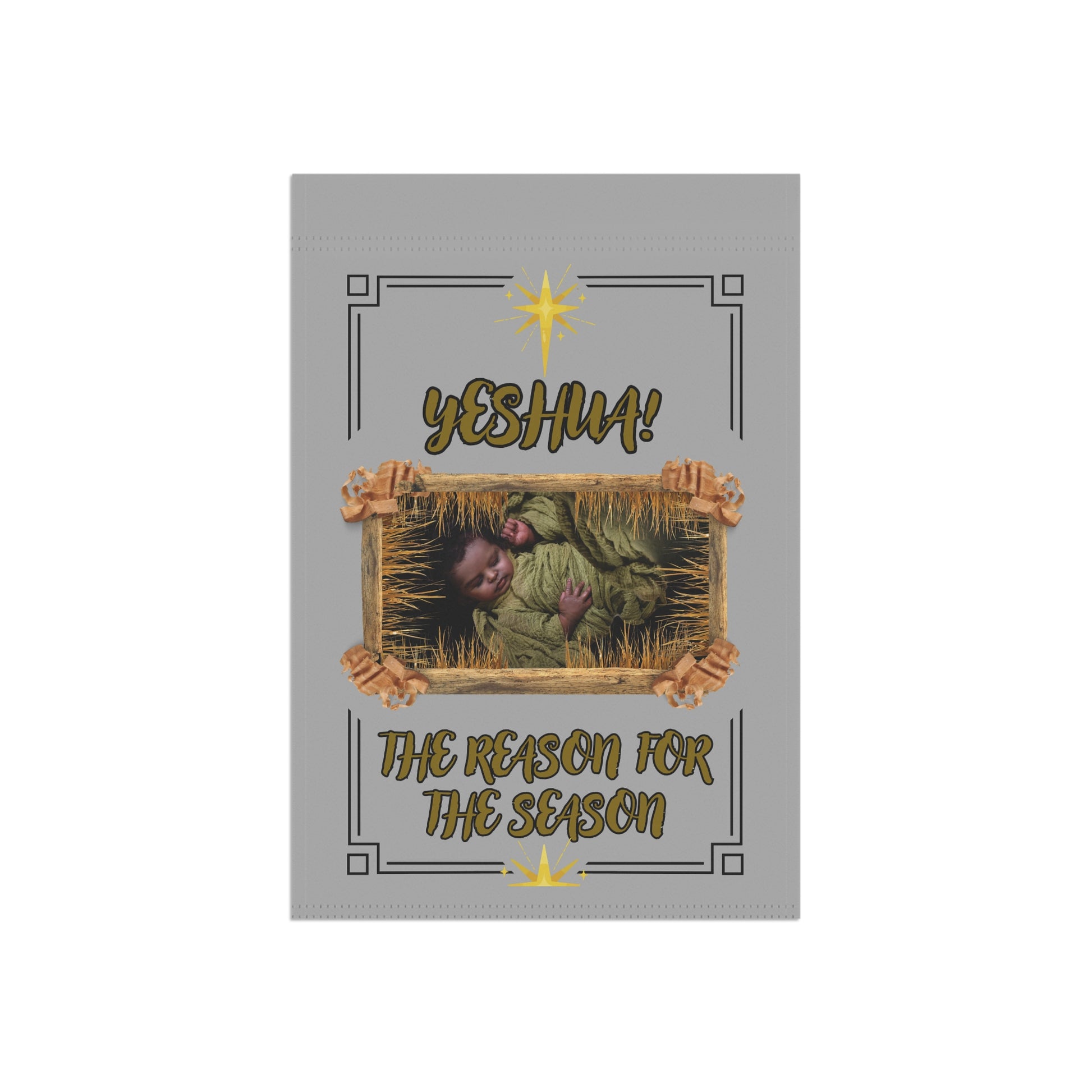 Yeshua! The Reason For The Season" Nativity Garden Flag – Nativity Themed Baby In A Wooden Manger in Gray