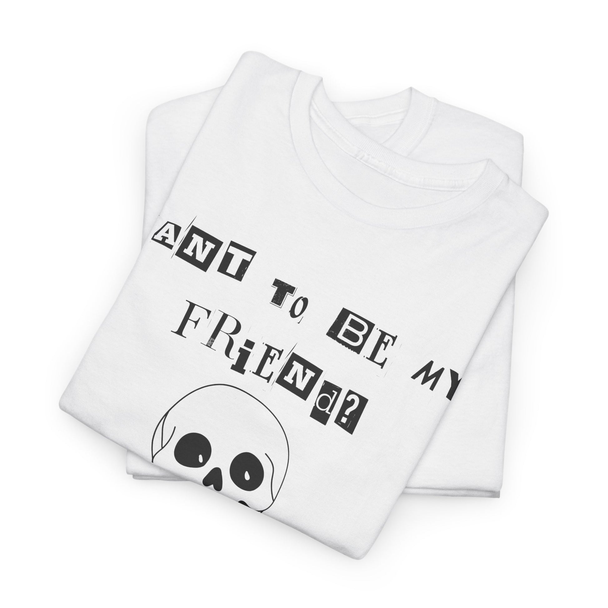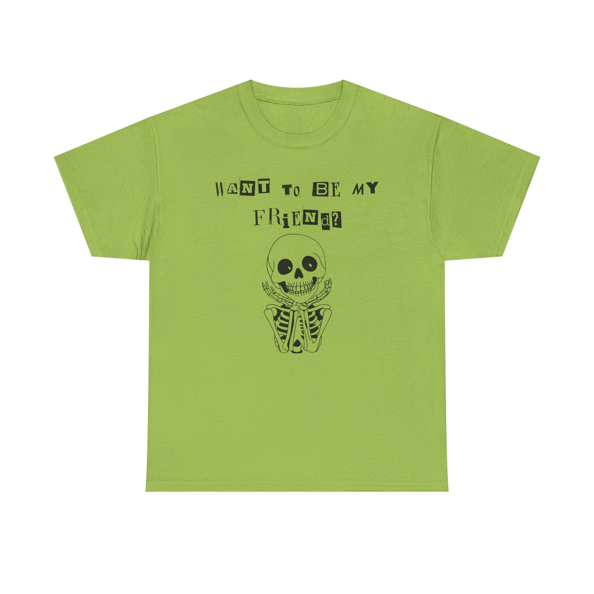 Step into comfort and style with our " Want To Be My Friend?" Unisex Heavy Cotton Tee, ideal for casual outings or lounging at home. Our fun and whimsical and lovable skeleton design brings a lighthearted vibe, making it a perfect conversation starter! Whether it's for Halloween, a casual get-together, or just to express your personality, this tee fits seamlessly into any wardrobe. It's designed for adults who appreciate both comfort and a touch of humor in their attire. The item comes in 9-10 different colors depending upon size availability. Great for gift-giving during holidays or just to brighten someone's day!